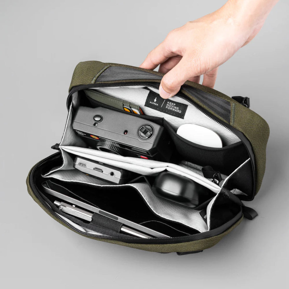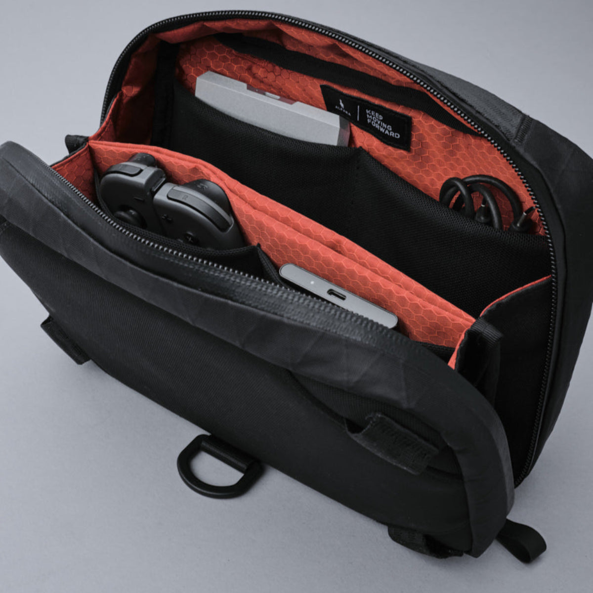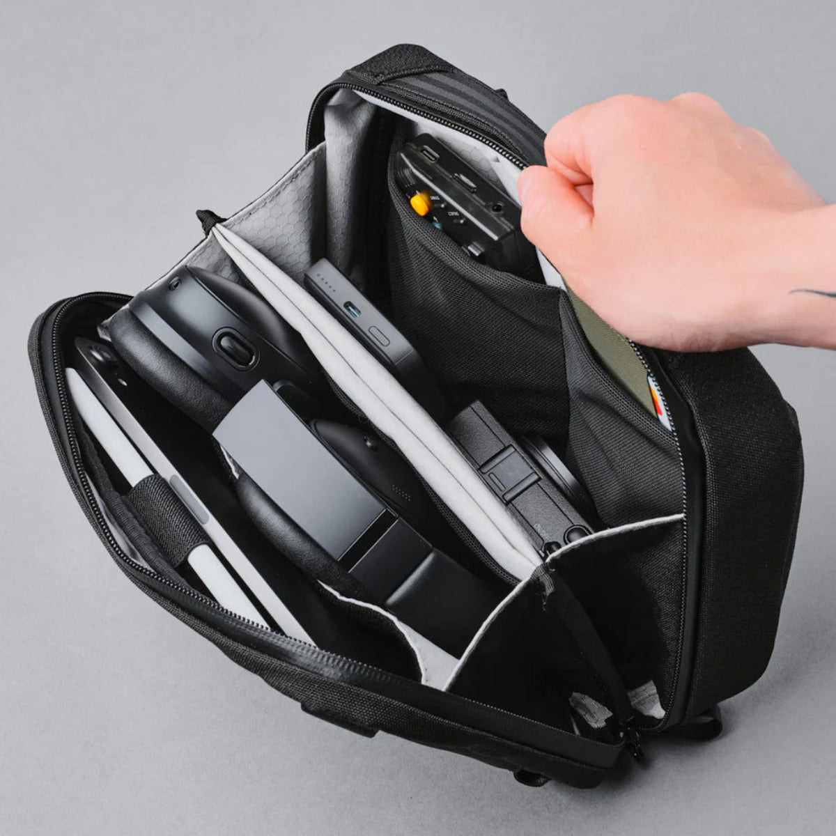 科技收納袋 MAX 設計簡潔,讓您保持整潔,而且可以變成單肩包,在旅途中讓您保持雙手自由。